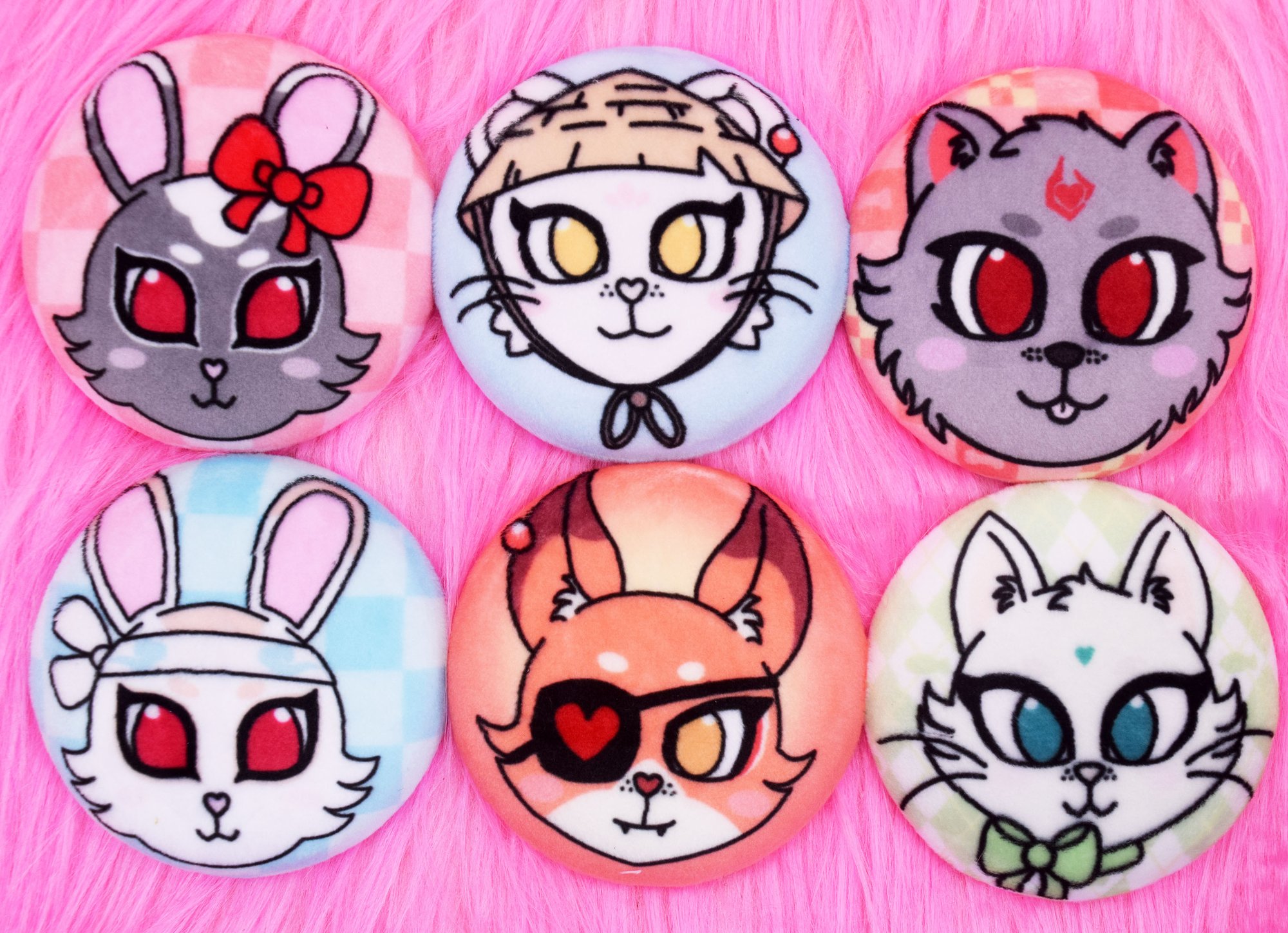 A collection large plushie badges featuring characters from MXTX's Danmei works.