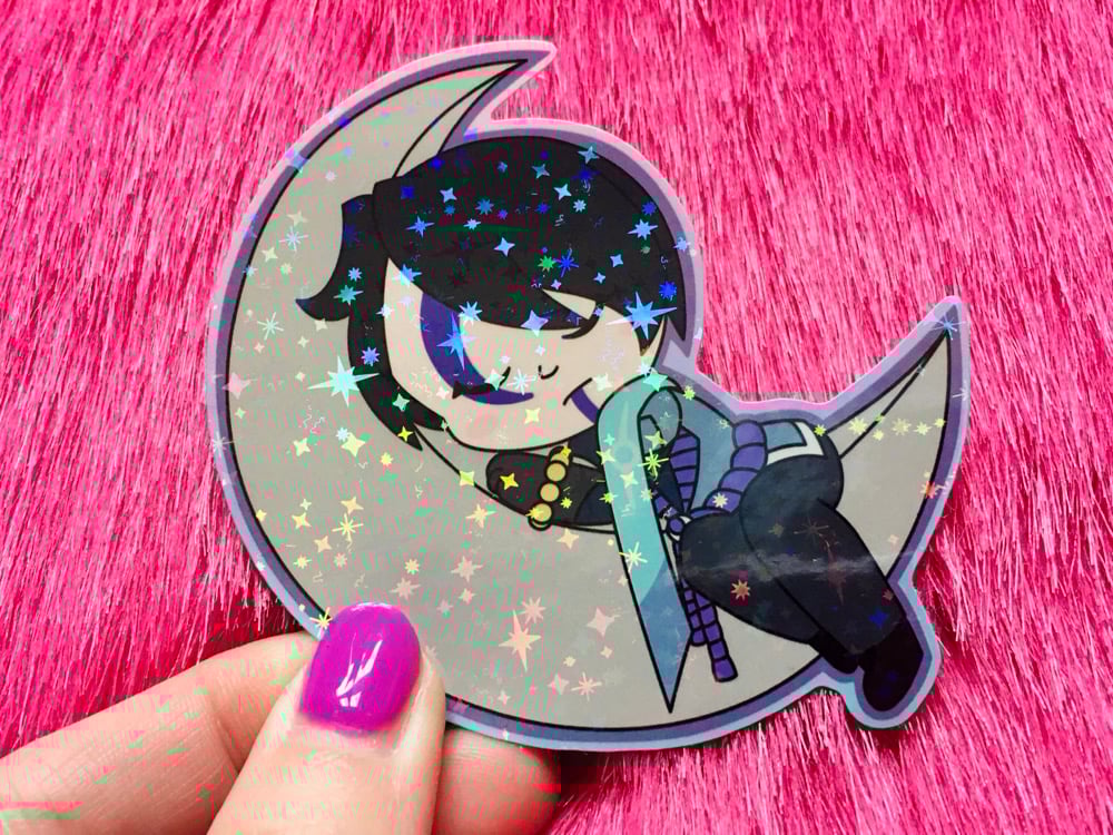 A cute acrylic glitter keychain and sticker featuring Aphelios from League of Legends.