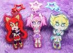 A collection of cute charms featuring the Star Guardian versions of Jinx, Ezreal and Lux with their magical mediums.