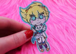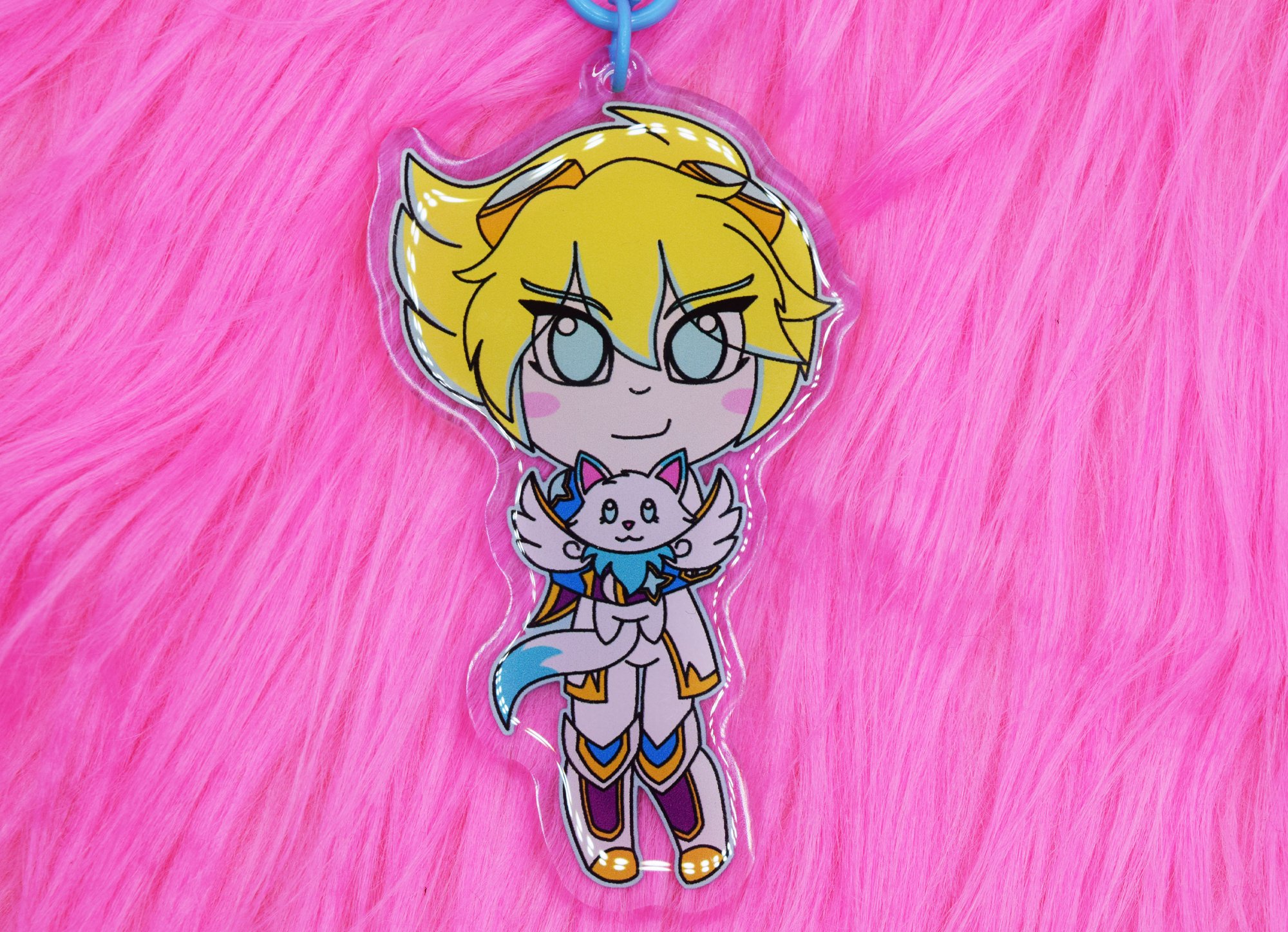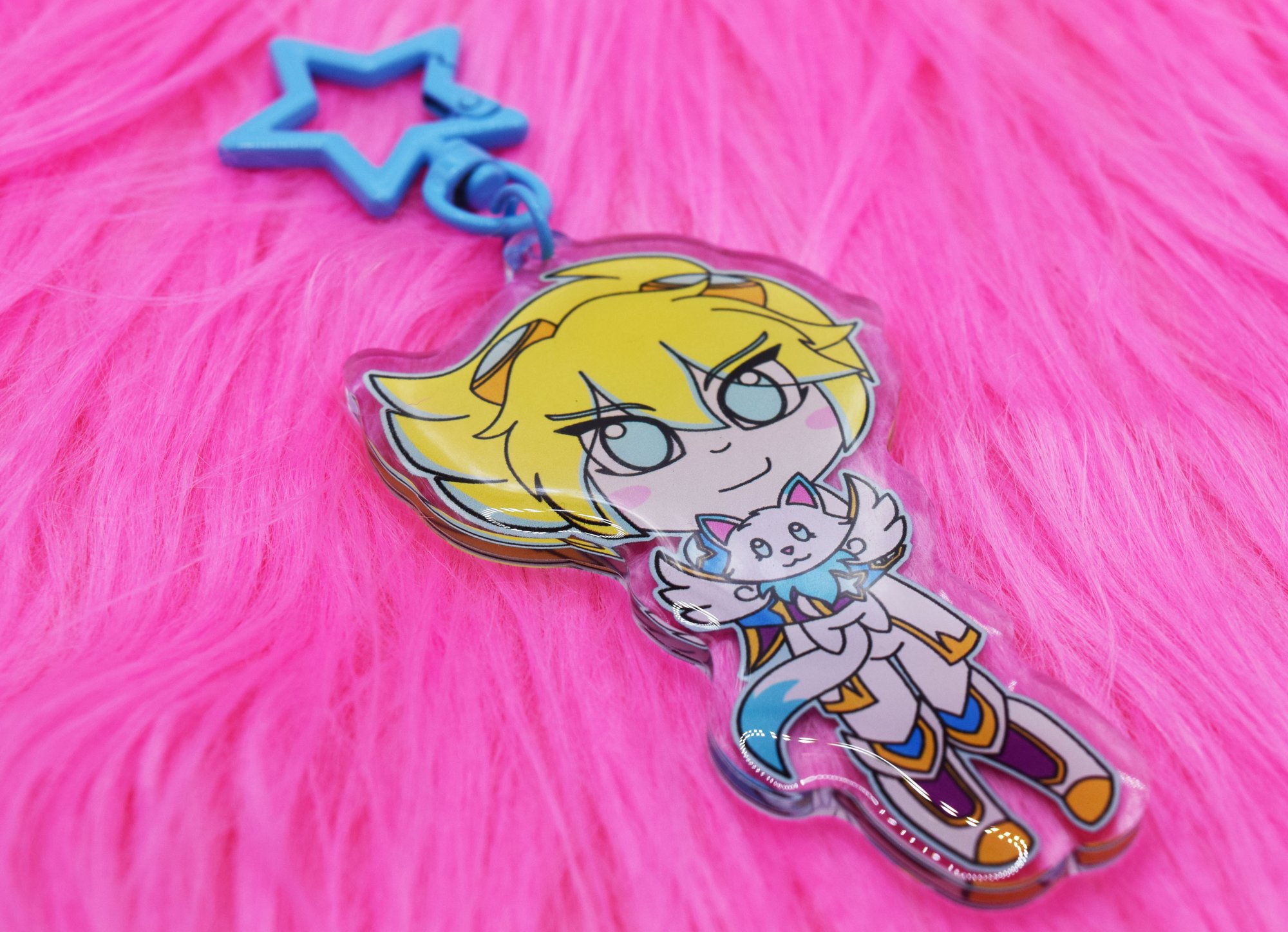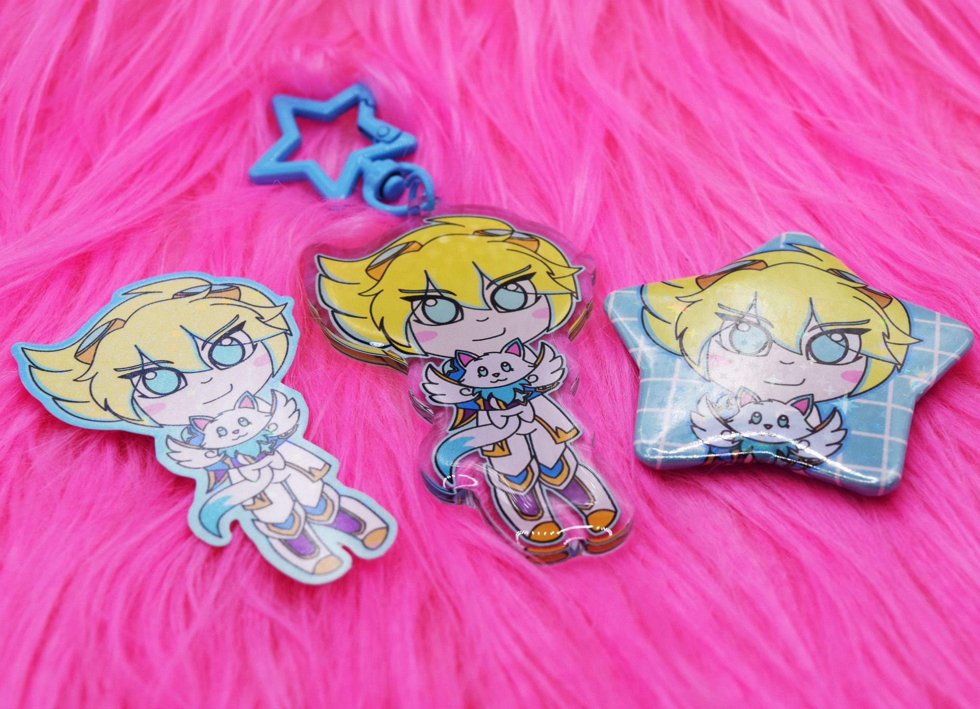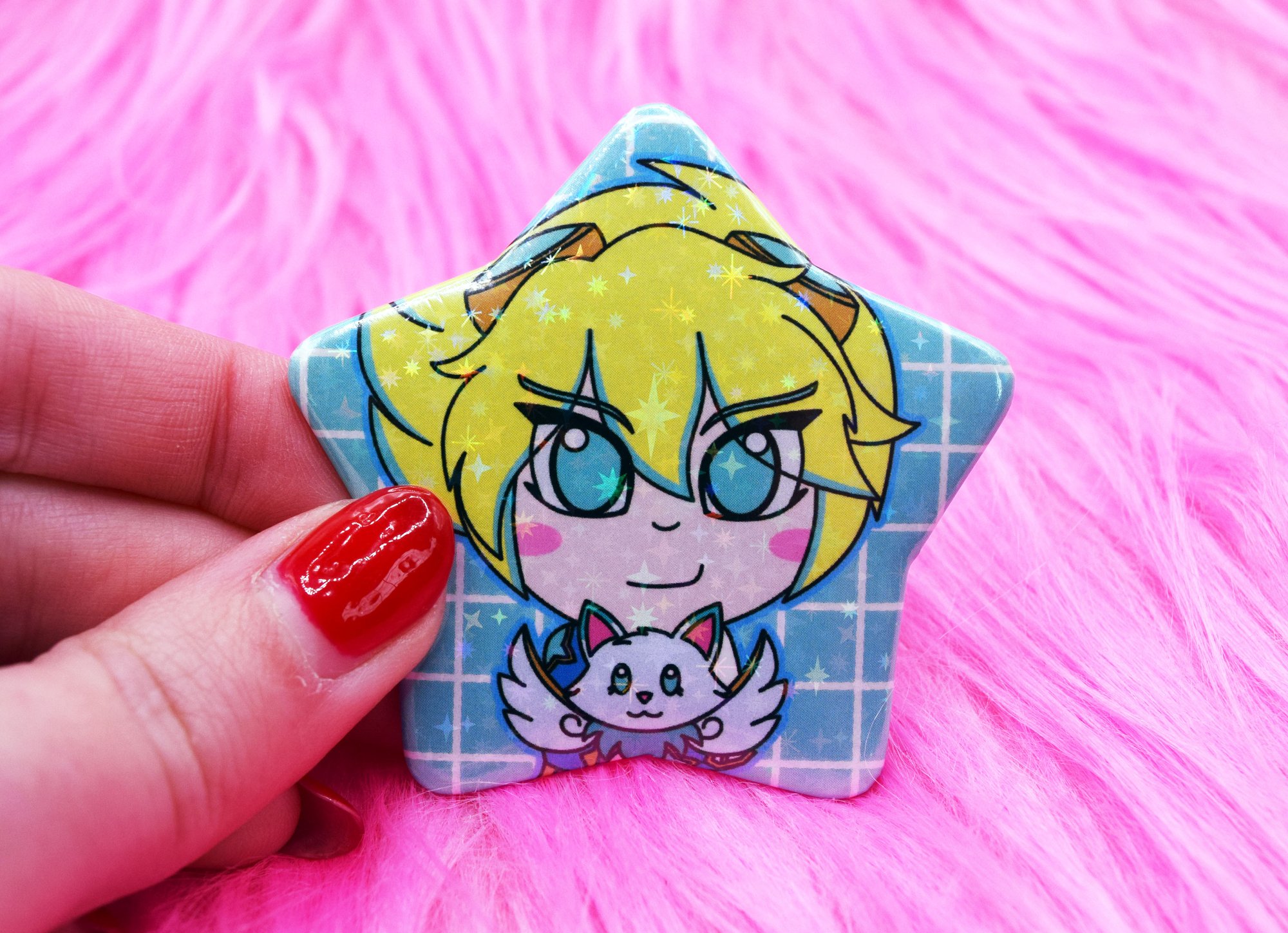 Choose from a acrylic charm, star-shaped holo badge or holo sticker.
